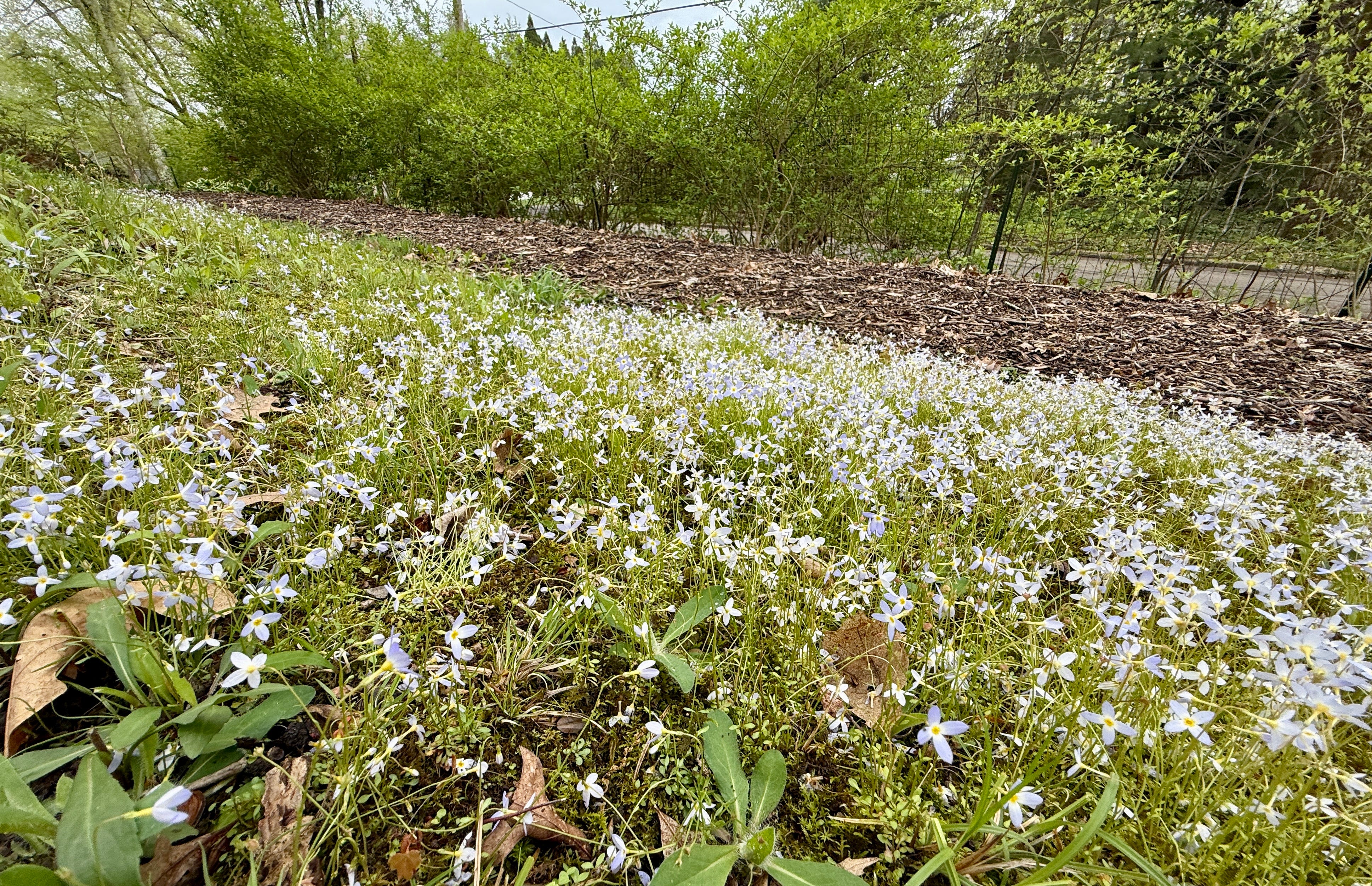 The bluet has tiny leaves, like grains of rice that lie on the green moss in the Woodland Garden at Havenwood. Just near the marker #35 for the “Wood Chip Path” on our new map, there is a blue pool of flowers that keeps getting better and better this month as the warmer weather helps them to develop. As we get further into May, the blue pool will widen and then gradually begin to drain away as the flowers go to seed.